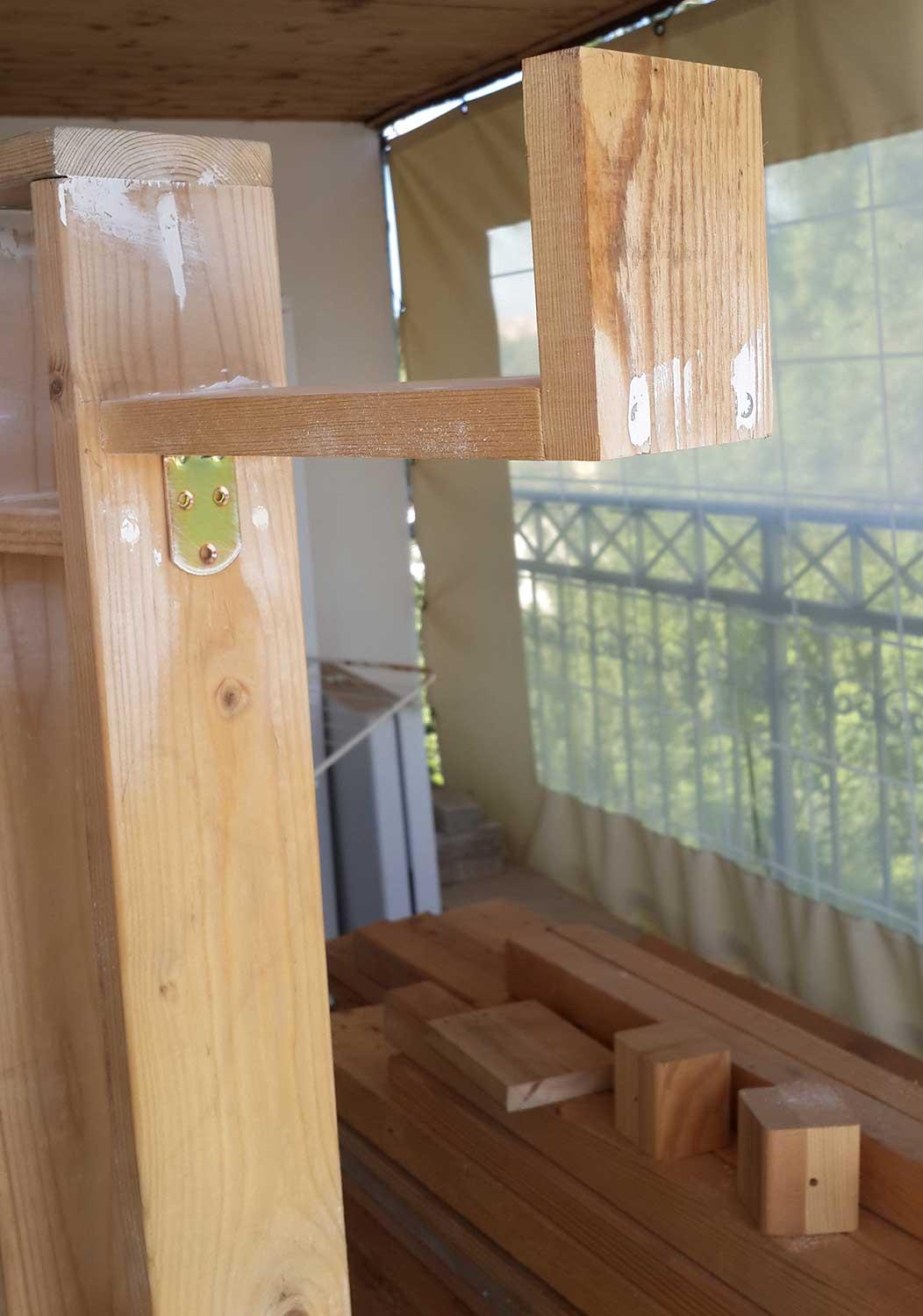 The next one to solve is #4 - I could add a plywood in the back to secure it to itself but it will add weight, so the easier solution was to add connection to the wall it self in the form of r. I thought 2 on each arm, 2 or 3 to the body and if you are paranoid 2 for each stock. Solved.