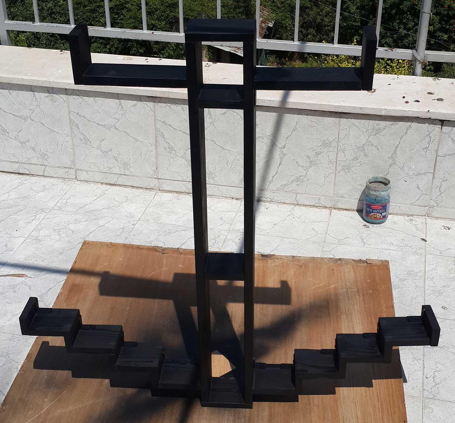 The design and planning it toke a long time (not on full time job scale) but few seconds to minutes here and there across 2-3 months before I started working on it. The plan and design change even during the planning, as I was in version 1, I started to pick the wood to work on it and than came a thought of adding bottles in body itself so the design changed to reflect that. When I started to assemble the wood (not connecting it yet) just laying it together, I looked at it and it seems empty, so I added the shot glass place on the stocks and top of the body. At some point while preparing it for painting (that was a question too: to paint or not? and if to paint, what color? [more about it later]), I saw that the 2 main body woods are in a very bad shape and need to be replaces, luckly I found a better wood to use but it was a little longer than the original, so all the spaces in the body had to adjust to the new height. All the work toke less than a week work (not even full time) in netto.